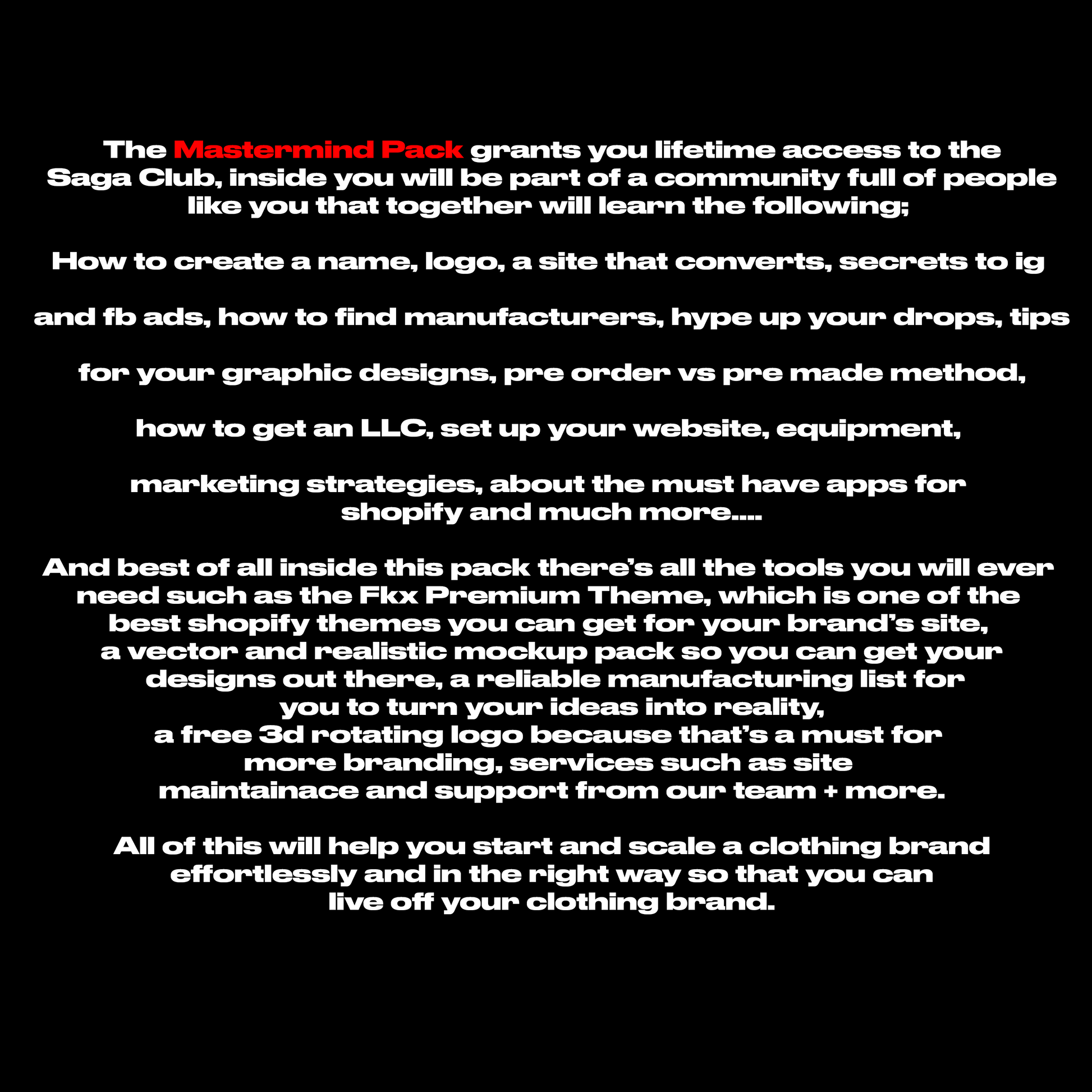 The Mastermind Pack grants you lifetime access to the Saga Club, inside you will be part of a community full of people like you that together will learn the following;